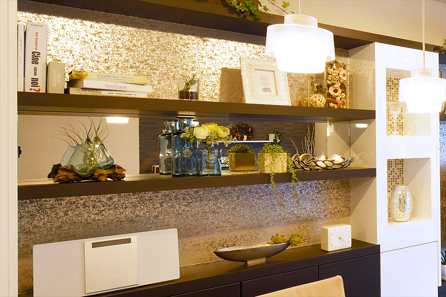 壁面収納の背面には、光沢のある素材を使用したクロスを貼ったり、飾り棚は部分的に背面を鏡にしたり、モデルルームにあった壁面収納のイメージをアレンジして、ディスプレイが映えるデザインが実現できました。