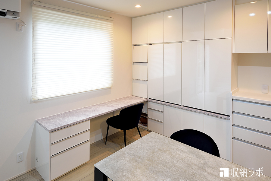 コーナーを活かしたデスク付き壁面収納で、ワーキングスペースを実現。
