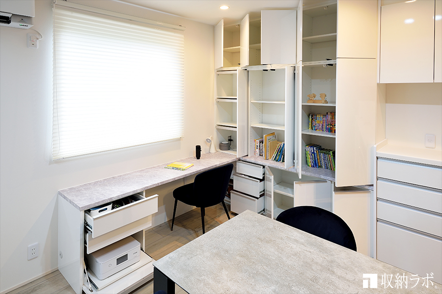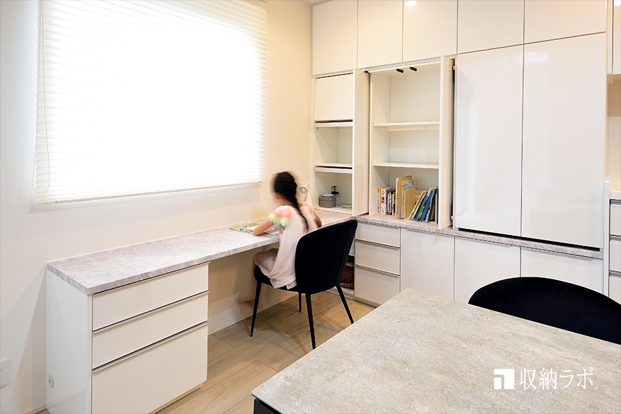 壁面収納には、教科書や辞書などを収納する予定で収納スペースを作りました。教材を収納するスペースは、勉強中は開けたままにする方が便利なので、扉を垂直に収納することができる収納扉を採用しました。