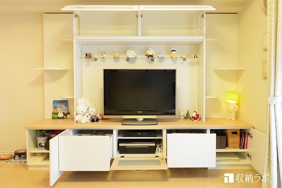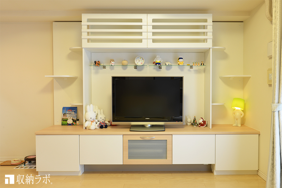 そうした要望を叶えた壁面収納のデザインは、収納スペースを下段にまとめて、テレビ周りはコレクションのグッズを飾るためのディスプレイスペースと、キャットウォークになりました。