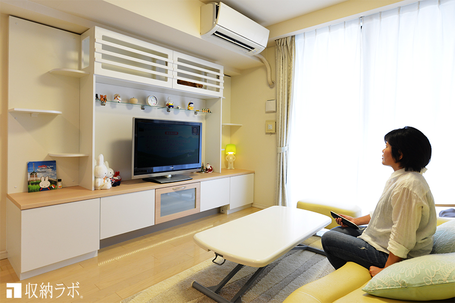 私の要望は、たくさん物を収納したいということよりも、統一感のあるリビングにしたい、テレビのリモコンや郵便物など、テーブルの上の小物をすっきり片付けたい、そして猫と私が快適に暮らせるリビングにしたいということでした。
