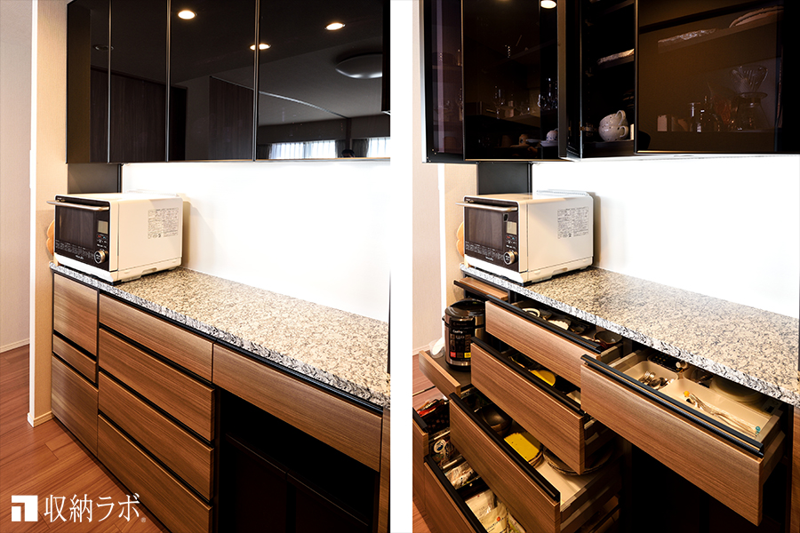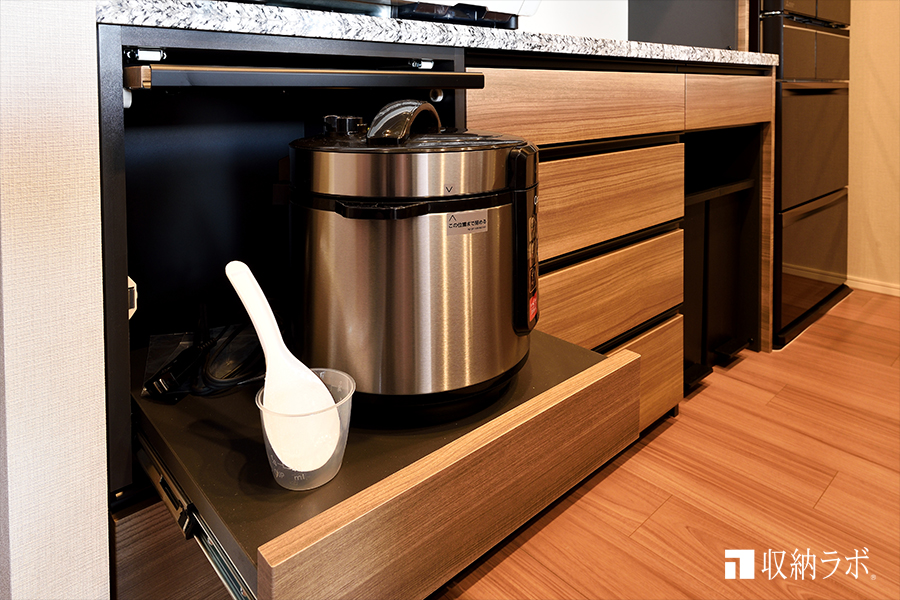 また、炊飯器を使う時には手前に引き出せる収納棚を使って収納できるようになっていて、扉は上に跳ね上げて水平に収納できる扉を採用しました。使っている時に便利な機能性と、収納している時のスッキリとした印象のデザイン性の両方が叶えられて気に入っています。