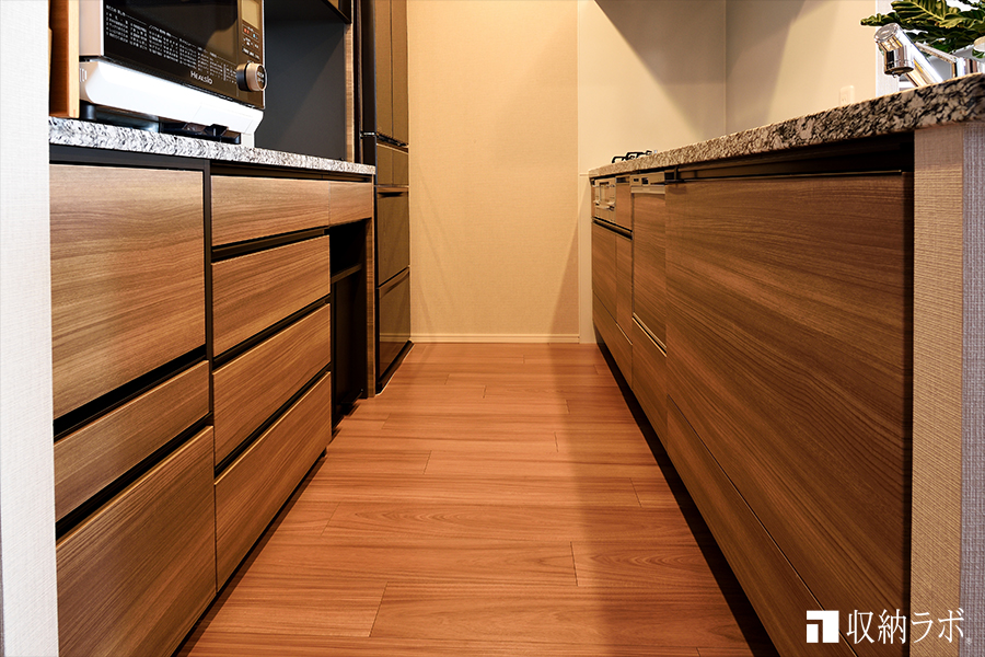 収納量や機能性の他に、既存のシステムキッチンとのコーディネイトが気になっていました。コーディネーターの方に、既存のシステムキッチンと同じ素材で食器棚を作りたいと相談してみると、同じメーカーの素材を取り寄せて、食器棚を作っていただけたので、私の理想がすべて叶いました。完成したオーダーメイドの食器棚は、既存のシステムキッチンと同じ印象に仕上がって、統一感のあるキッチンがとても気に入っています。