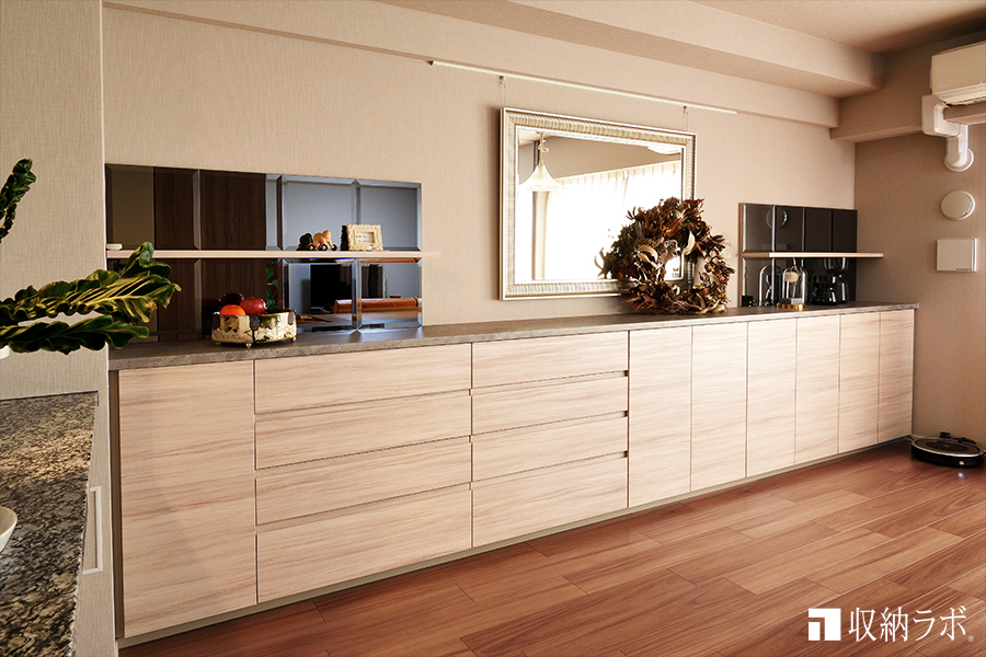 これまで、郊外の一戸建で一人暮らしをしてきたのですが、年齢的にこれからの生活を考えて、生活に便利な都心のマンションへの引っ越しを決めました。娘も近くで暮らしている事や、公共交通機関を使う事を考えると、とても便利な立地なので購入を決めたマンションだったのですが、いざ引越しをしてからの新しい生活の事を考えると、収納が足りない事に悩んでいました。マンションのオプション家具や既製品の食器棚やダイニング収納を探していたのですが、デットスペースを無くして、暮らし方に合った収納を作りたいと思い、収納ラボでオーダー家具を作りました。