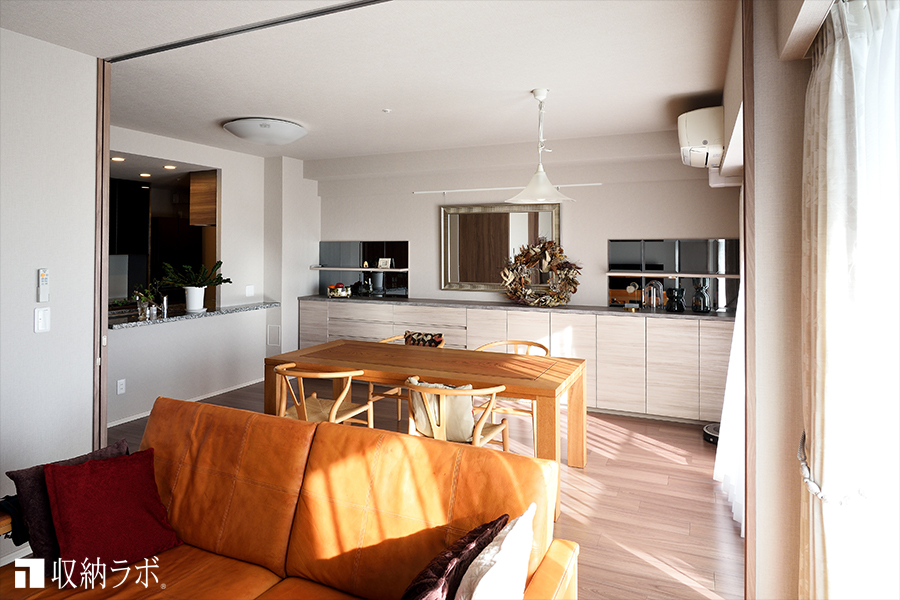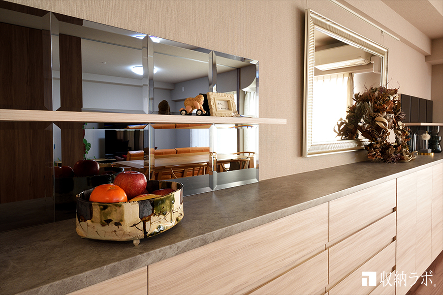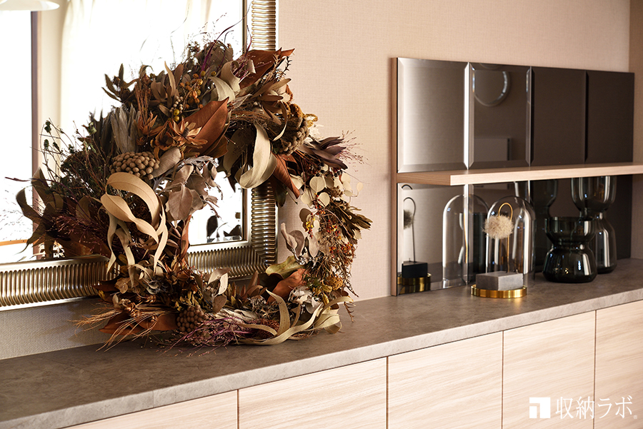ダイニング収納の天板には、趣味で集めた物を飾ったり、娘と二人で作った大きなリースを飾る場所も出来ました。また、娘のアイデアで天板の壁面には、鏡と棚板を組み合わせた飾り棚を左右に作っていただきました。収納スペースを確保しながらも、好きなものを飾ったり、季節ごとのインテリアを楽しむことが出来るので居心地の良いダイニングになって嬉しいです。