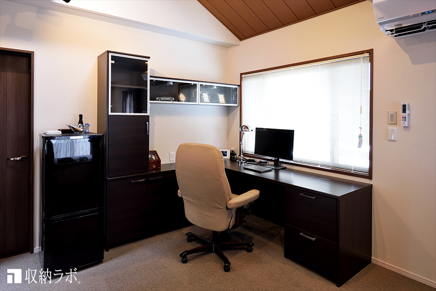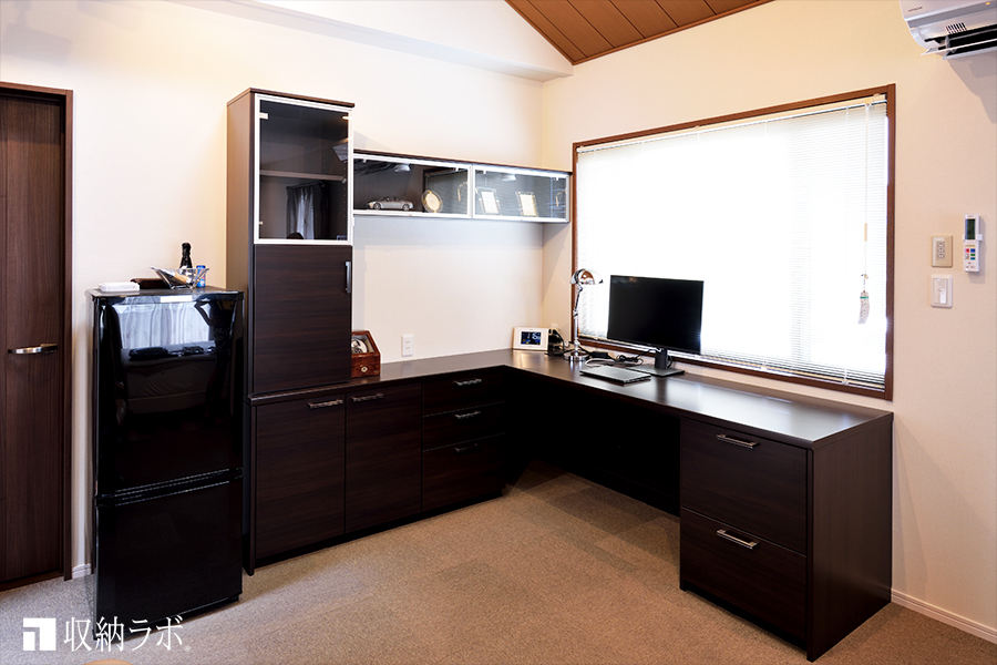 また、ワークデスクの横に置いた冷蔵庫は、ここでお酒を楽しむためのもの。こうしてプライベートルームとしても居心地の良い空間を実現する事ができました。