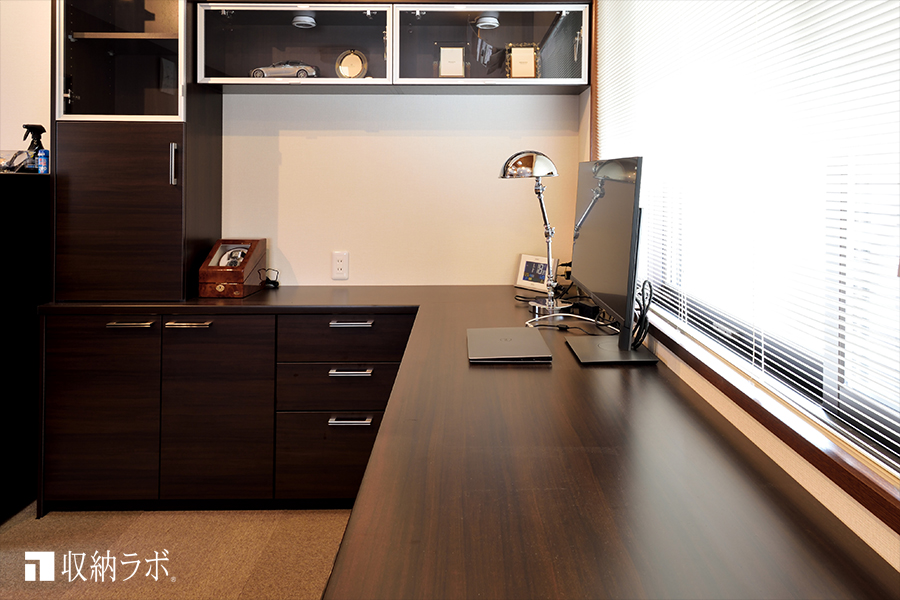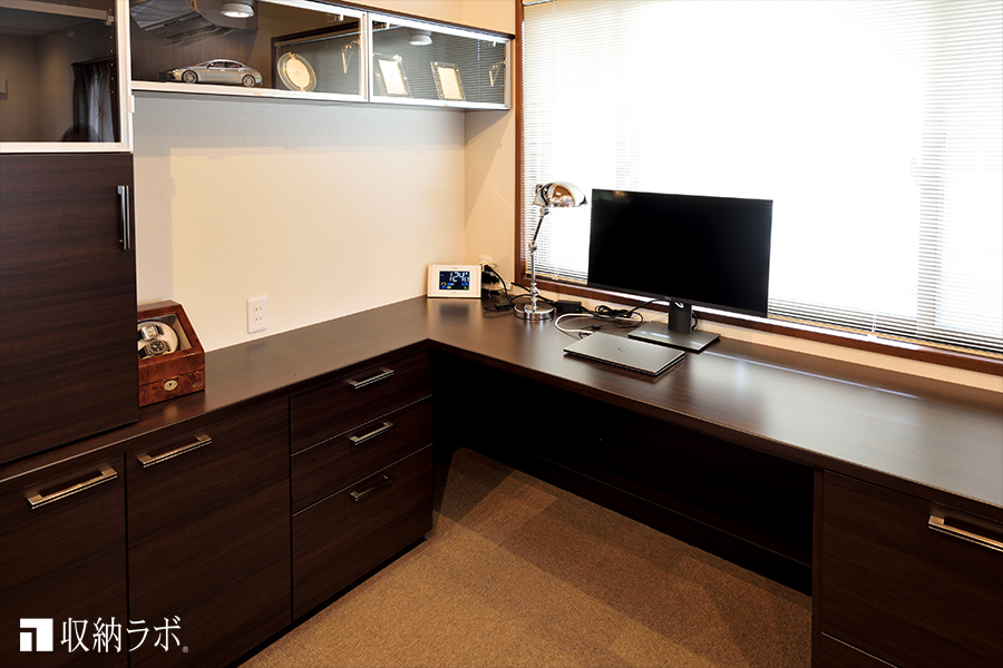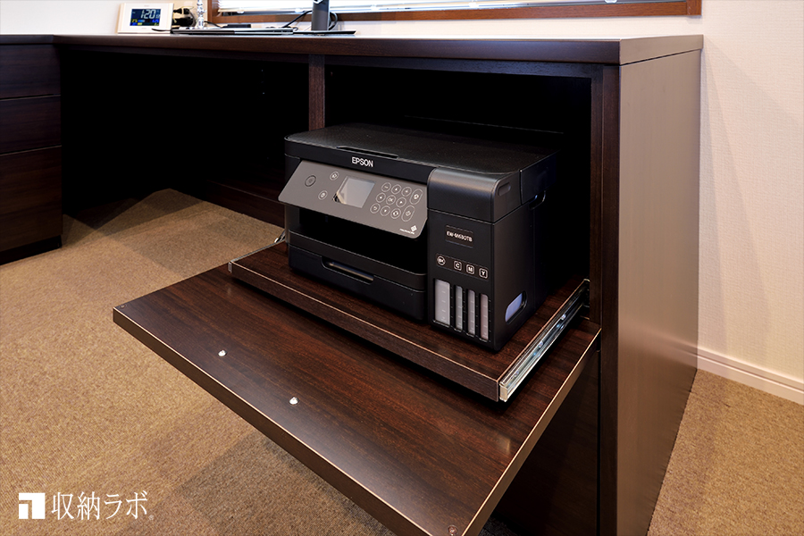 高級感のある雰囲気を実現することと同様に、ワークスペースとして機能性にもこだわりました。置き場に困っていたプリンターは、サイドキャビネットの中に収納。必要な時には引き出して使えるようにスライド棚を採用しました。普段は扉を閉めると隠せるので、見た目もスッキリしました。