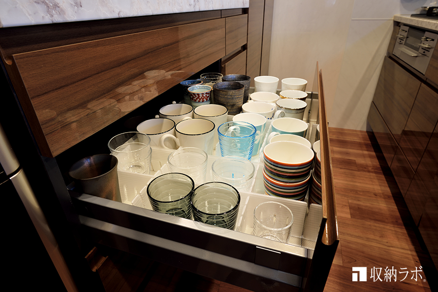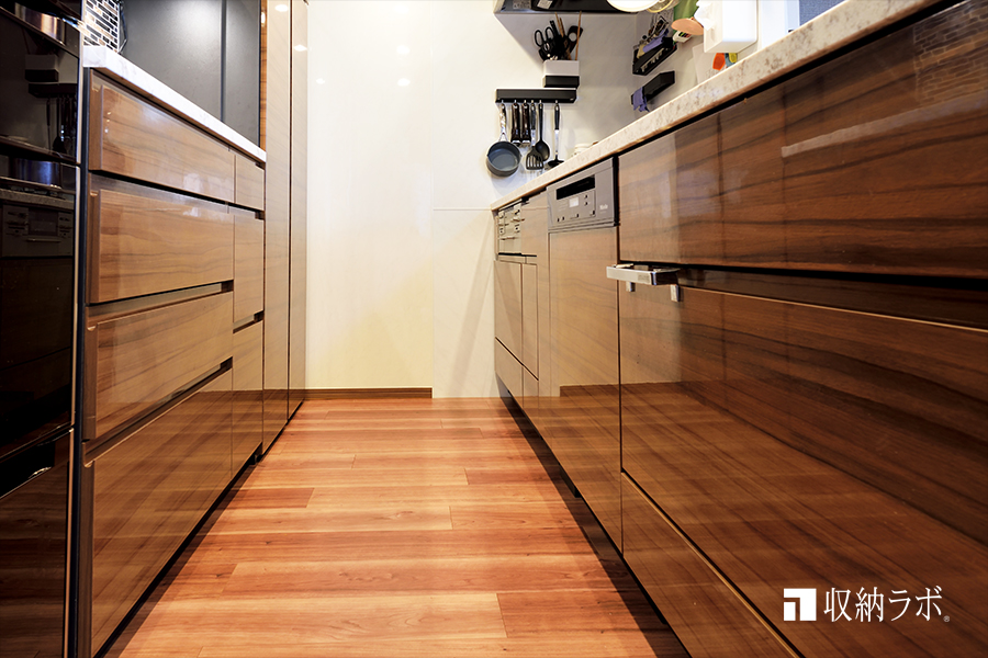 カウンター下の引き出しには日頃よく使う食器類を収納、鍋や大きなボウルなどは一番下の引き出しに収納するようにしました。こうした日常の家事を想定した収納方法を相談しながらプランニングを進めていけたので、スムーズに家事が行えるキッチンを実現することができました。