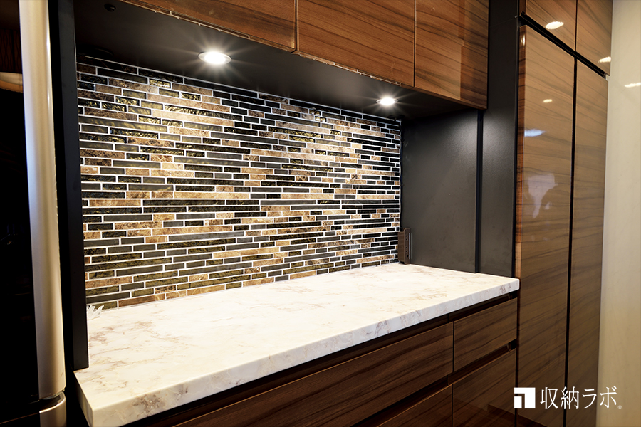 それとデザインについてのこだわりで、食器棚の背面にモデルルームで見た時に気に入っていた、モザイクタイルとLED照明を取り入れてもらいました。食器棚の照明をつけると、とてもおしゃれなキッチンなので部屋全体の雰囲気が良くなりました。
