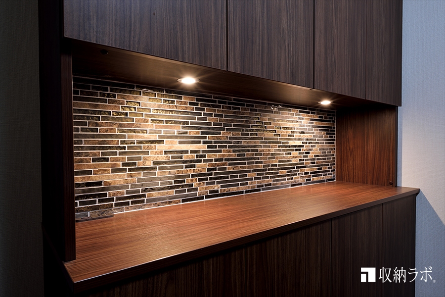 間接照明を活かして、おしゃれなインテリアと収納を実現したオーダーメイドの壁面収納。