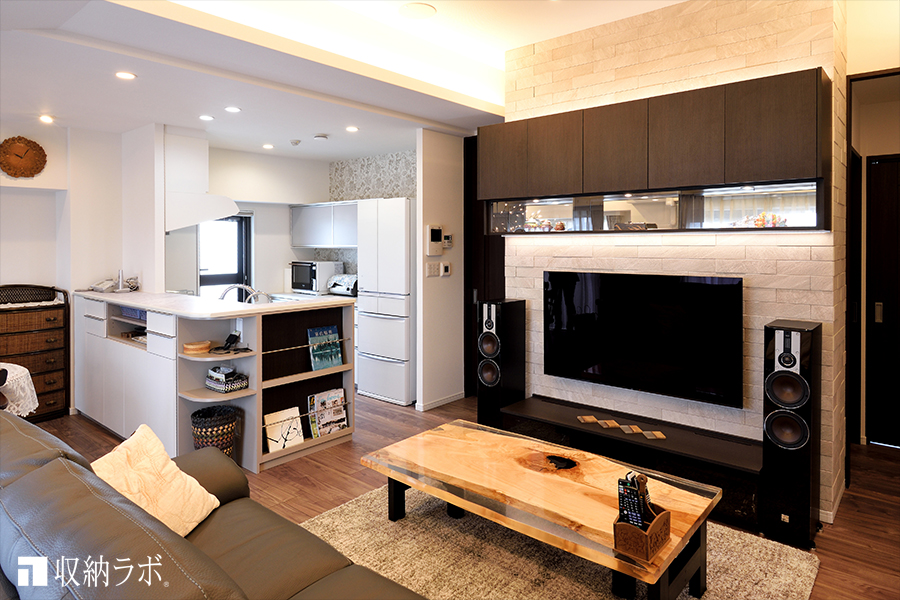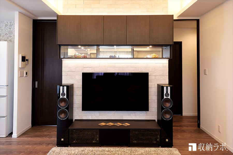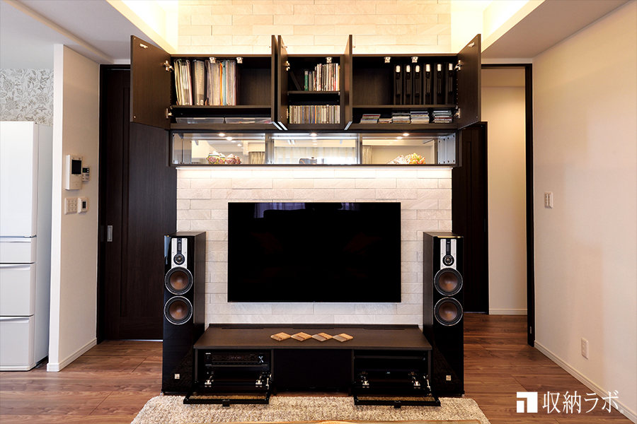好きな音楽を楽しむために、ホームシアター用スピーカーに合わせてリビング収納をオーダーメイド。