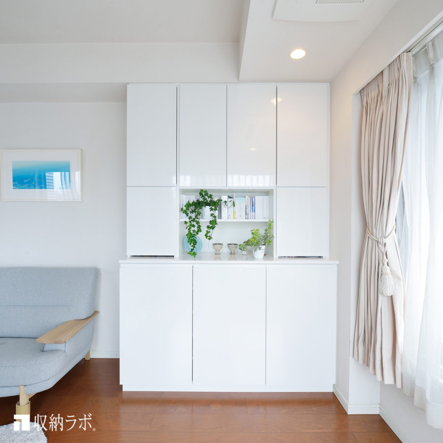 天井までの壁面収納。お部屋のイメージに合わせた、白を基調とするシンプルなデザイン。中央をオープンスペースにすることで立体感が生まれ、圧迫感が解消されています。飾られている緑が差し色に。ソファーと壁の間にすっきり収まるようデザインされています。