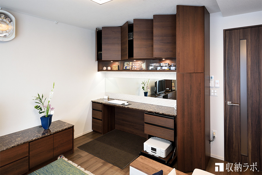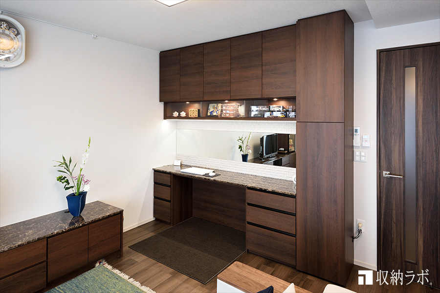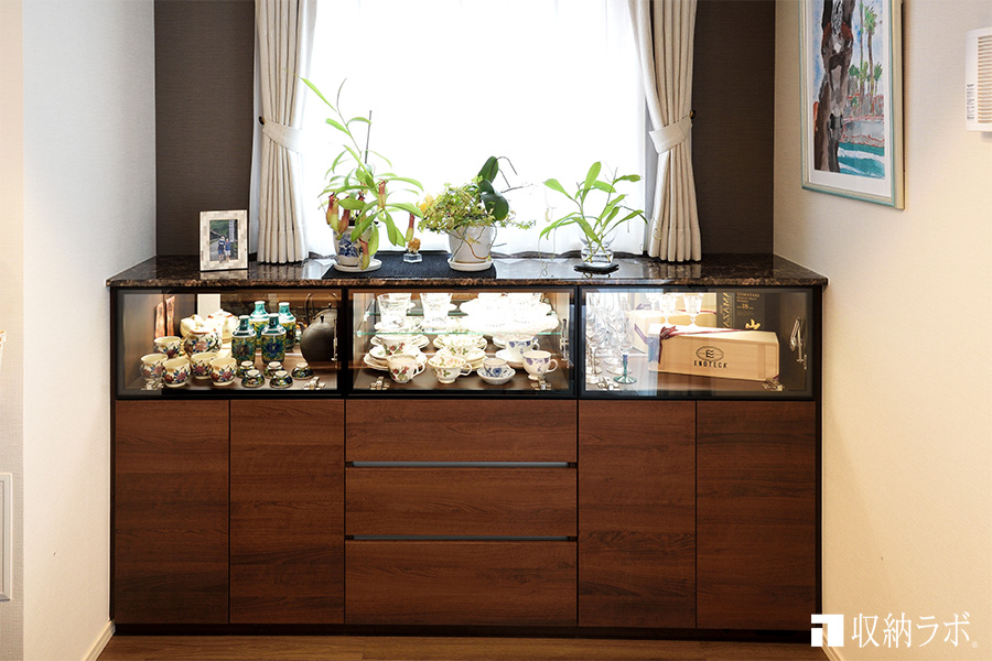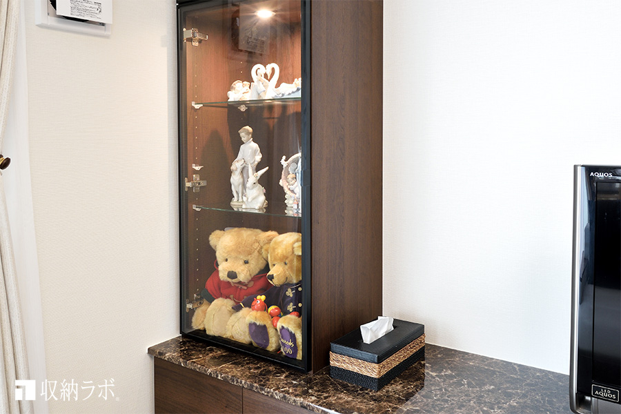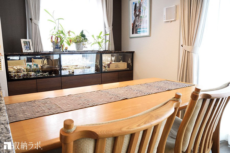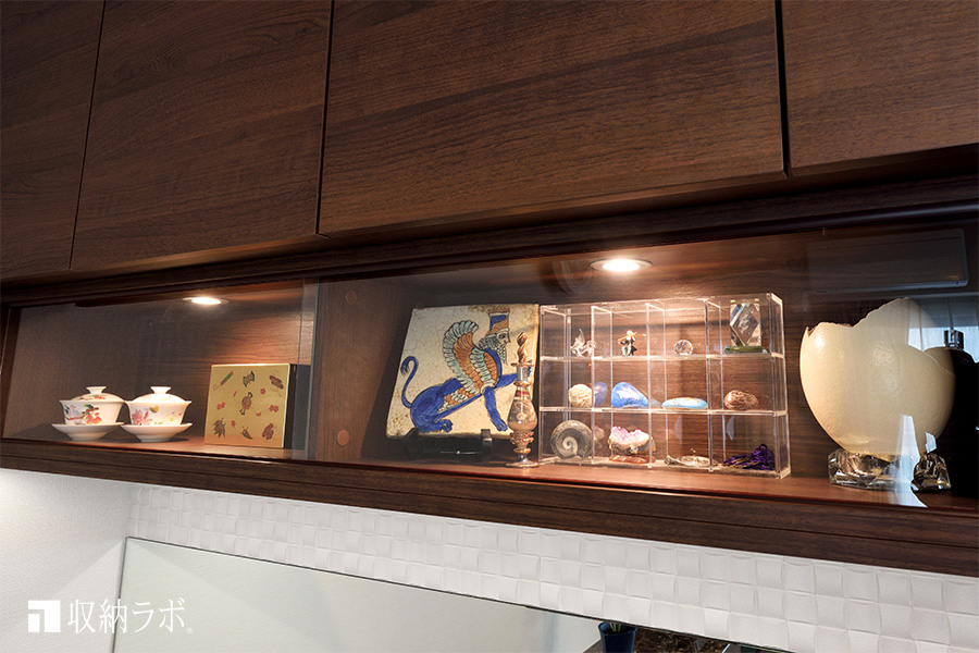 これまでは飾る場所がなくて仕舞い込んだままだった、記念品やお土産、コレクションなどを飾るスペースが欲しいとお考えでした。今回プランしたデスク付き壁面収納、リビング収納、ダイニング収納にはそれぞれに飾り棚を作りました。飾ってあるものがキレイに見えるように、LED照明や背面に鏡を組み込みショーケースのようなイメージに。長年大切に保管されていたものを、眺めて暮らせる居心地の良いお部屋を実現し、大切なものを飾る楽しみが増えました。