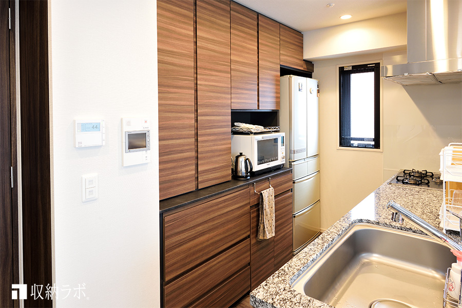 キッチンの食器棚は、出来るかぎり調理家電やゴミ箱などキッチン周りのものは、スッキリと隠したいというご要望を叶えました。それと同時に家事をしている時の使いやすさに配慮した収納を実現しました。