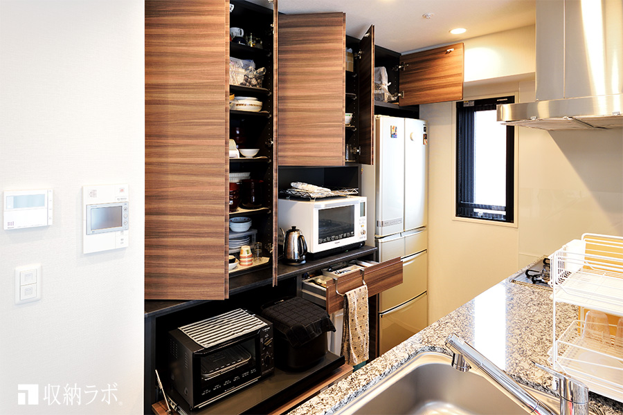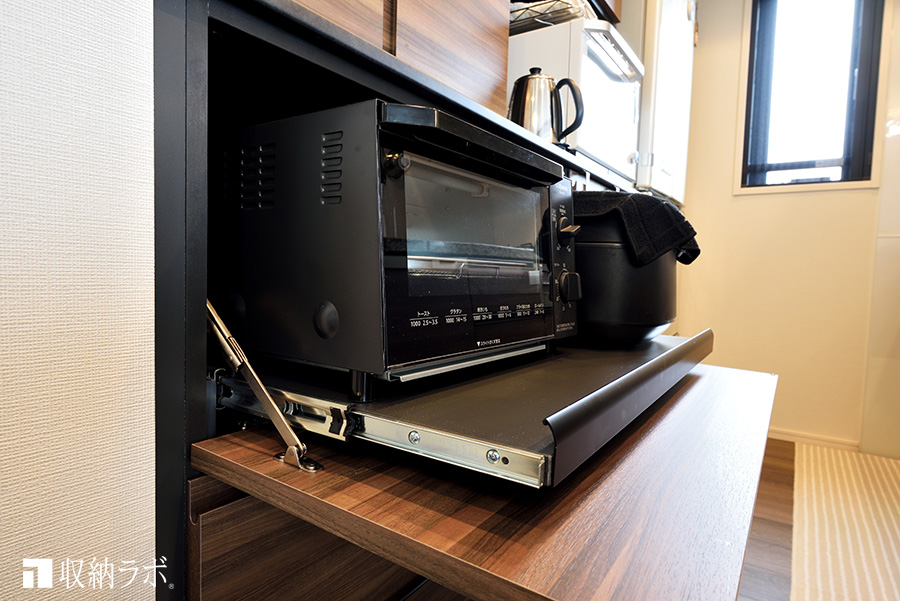炊飯器とトースターはスライド棚にのせて収納しているため、調理中には引き出せるので実用的です。