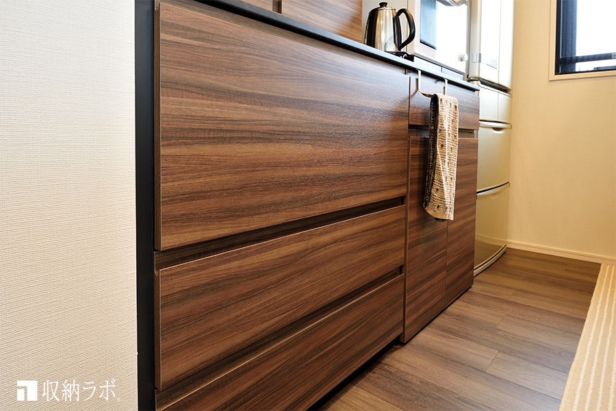 扉や引き出しに使用した面材については、光沢のある素材と光沢のない素材を迷っていらっしゃいました。落ち着いた印象のインテリアが理想でしたので、光沢のない素材をおすすめしました。またダーク系の色の場合には、光沢のある素材に比べて、手で触れた際に指紋の跡が目立たない事もおすすめのポイントです。