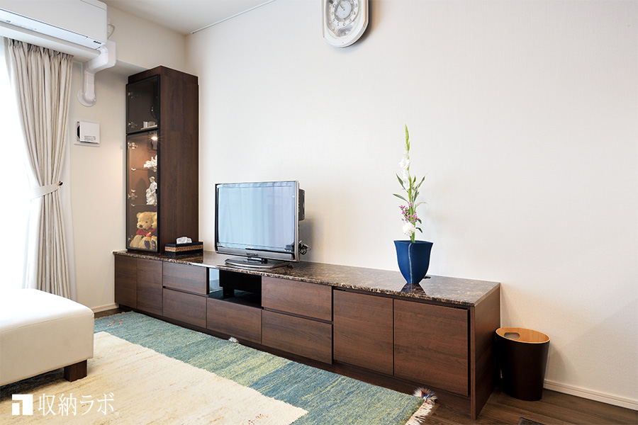 テレビ台と食器棚が一体となったオーダーメイドの壁面収納