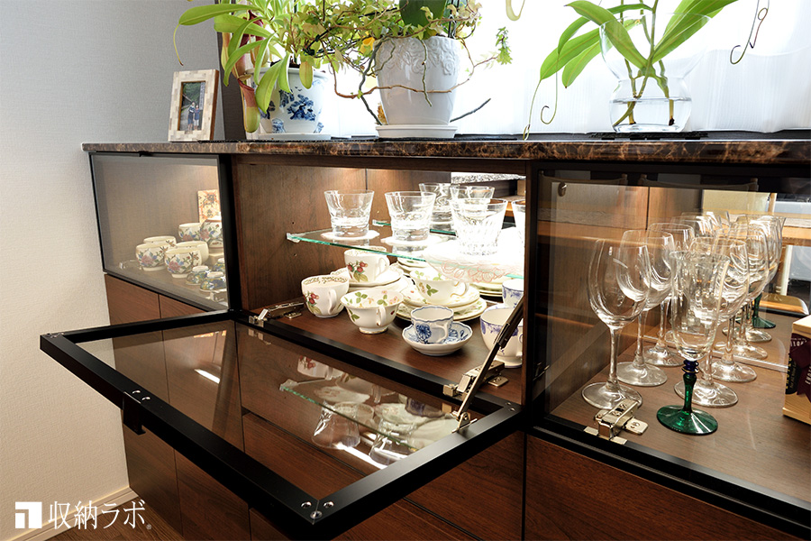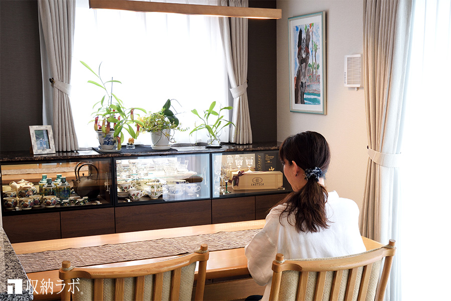 『今回作っていただいたオーダー家具はどれも素敵です。中でも一番気に入っているのはダイニング収納です。飾り棚には結婚記念で頂いた九谷焼や、趣味で集めたグラスなどを飾っています。