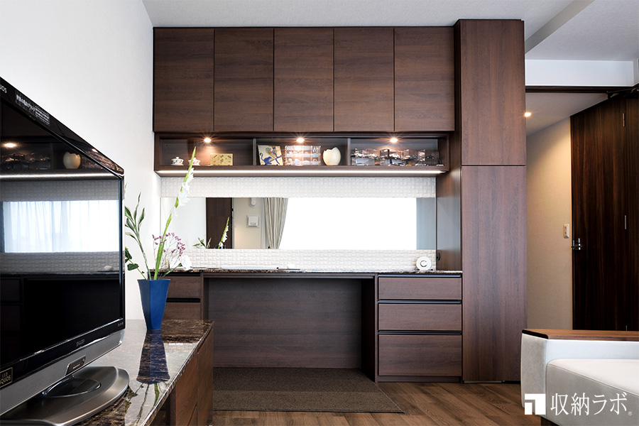 デスク付き壁面収納は、ホテルにあった大きな鏡がついたデスクのイメージです。背面には鏡とエコカラットを貼って、ホテルのようにおしゃれなインテリアを再現。ワークスペースやドレッサーとして多目的に使えて、掃除道具も収納できる実用的な壁面収納になりました。