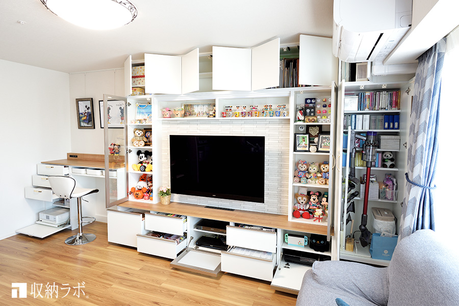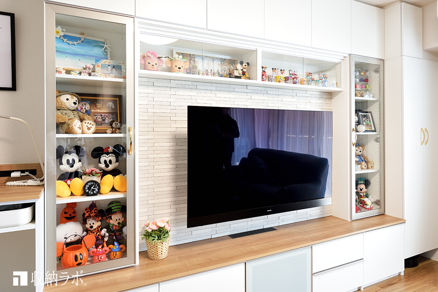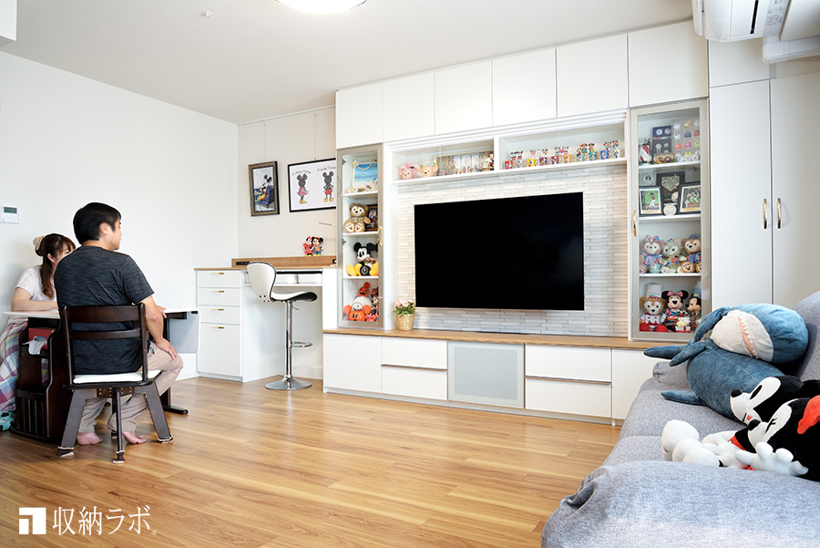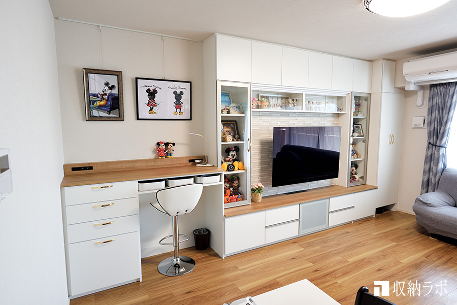 奥様の理想は、大好きなミッキーマウスのコレクションをたくさん飾れるリビングで暮らすことでした。マンションの購入が決まり、理想を叶えるためにご相談いただき、飾り棚とデスクスペースを組み込んだ壁面収納で理想のリビングを叶えました。
