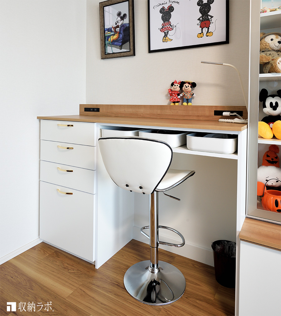 ミッキーマウスのコレクションを飾ることが主なご要望でしたが、掃除道具や日用品のための収納スペースも必要でした。デスクスペースには、特にご主人のこだわりが強く、コンセントの増設やプリンターの収納については、ワークスペースとしての機能性に配慮しました。