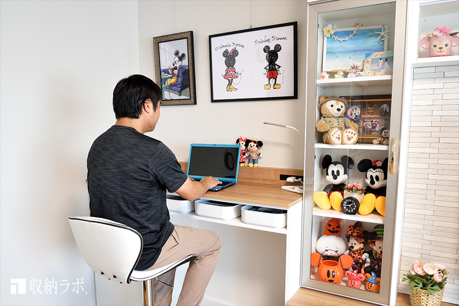 『これまで、ミッキーマウスのコレクションは収納BOXに仕舞ったり、個別に飾り棚を使って少しずつ飾っていました。壁面収納の飾り棚に大好きなコレクションを飾れるのが楽しくて、いつも眺めていられるので嬉しいです。