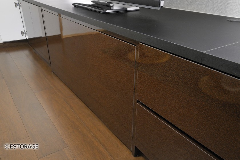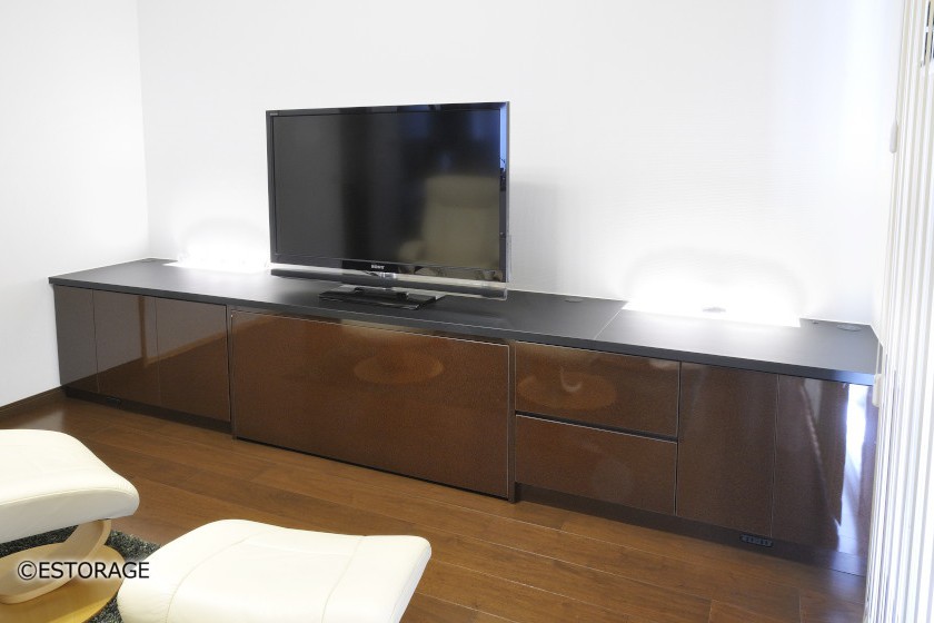 横巾1200mmの既存TVラックを上部に水平収納できる扉で隠せるように工夫し、TVボードの背面を天板面に組み込んだLEDライトでやさしく照らす様に設計しました。