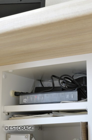 左側には文房具や小物を仕舞える引出とプリンター専用の引き出しでパソコン周りの配線をすっきり収めました。デスクスタンドを置く時に使えるコンセントも設置。