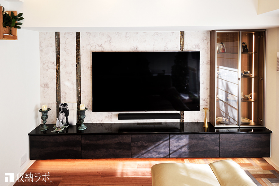お客さまの理想は、新居をホテルのようなインテリアにすることでした。そのため、収納に加えてコレクションを飾るための飾り棚や、インテリア小物をディスプレイできるオーダー家具を希望されていました。