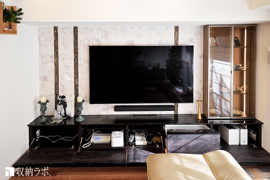 テレビの下に配置したキャビネットの中には、モデム、電話など電化製品を収納。こうした機器の電源コードやテレビの配線も、壁面やキャビネットの内側を通してあるため、扉を閉めると配線はすべて隠せるのでスッキリとした印象に。キャビネットの下に組み込んだLEDの関節照明は、フローリングを照らして床面を広く感じさせるとともに、インテリアをオシャレに演出する効果があります。