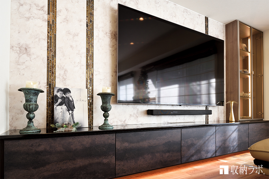 新しく購入したテレビはサイズが大きいため、壁掛けにすることを希望されていました。テレビの背面には、大理石調のメラミン化粧板を採用。モザイクタイルを使って縦に3本、ライン状のデザインを施して高級感のある壁面に仕上げました。