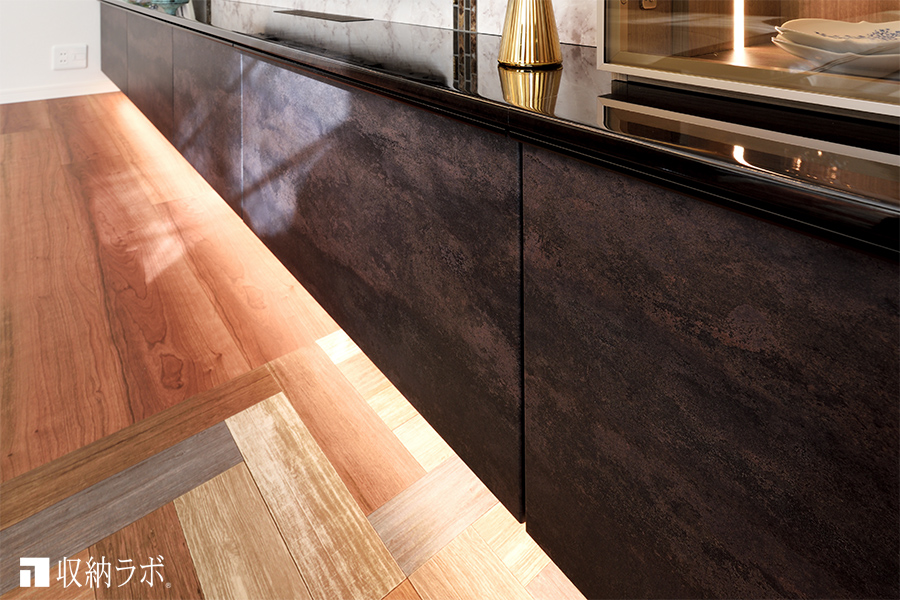 デザインはシンプルにして、素材にこだわり高級感のあるリビング収納をプラン。コレクションを美しくディスプレイするために、飾り棚の内側にLEDのライン照明を組み込みました。ライン状の光は、インテリアを引き立てるアクセントとしても効果的です。