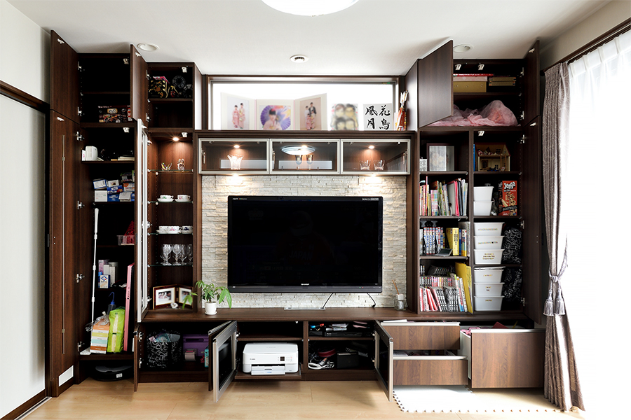 オーダーメイドのリビング収納は、想像していた以上に快適。