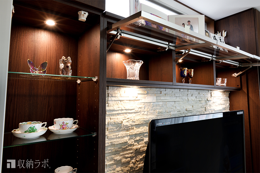 これまで、しまったままで飾っていなかったガラス細工のコレクションやグラス、食器を飾るために飾り棚も作りました。各収納スペースの組み込んだ照明は、ガラスの質感を美しく見せるためには効果的。インテリアとしても楽しめる、見せる収納を実現しました。
