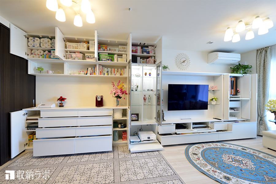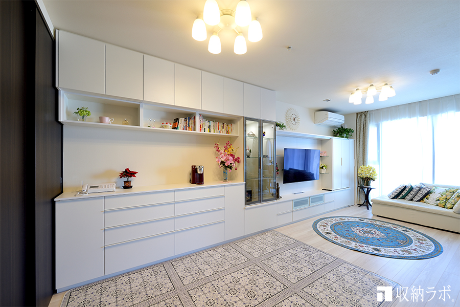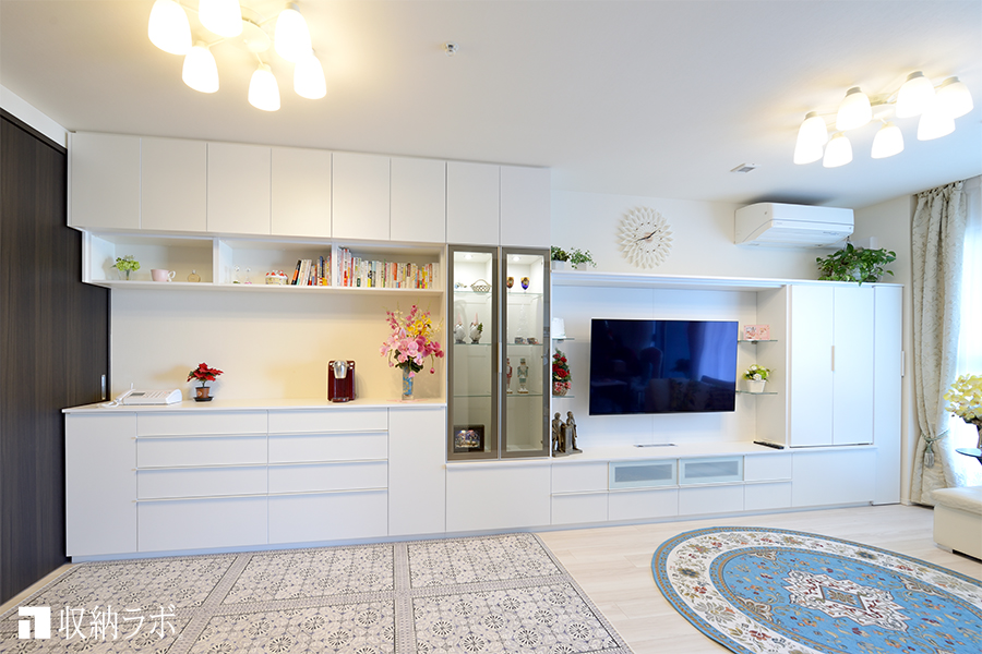 この問題を解決するために動き出したものの、既製の家具で横に長いリビングに合うものが見つかりません。やはりオーダーメイド家具の壁面収納にしたほうが自由度も高くていいのではないかと考えられたそうです。Webで検索して見つけたのが収納ラボでした。