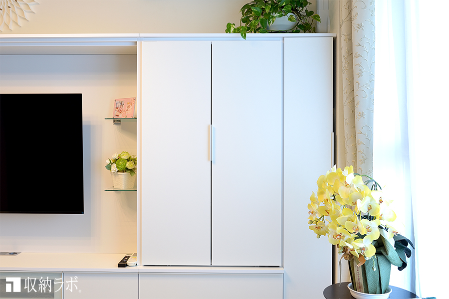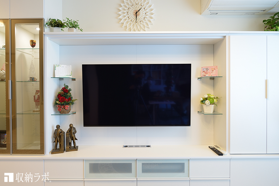 また、テレビを壁掛けにしてもコード類が見えてしまうと、どうしても生活感が出てしまいます。ですが、オーダーメイド家具の壁面収納ならテレビの後ろに配線を隠すことが可能です。見た目もスッキリさせたいというご要望にも応えることができました。