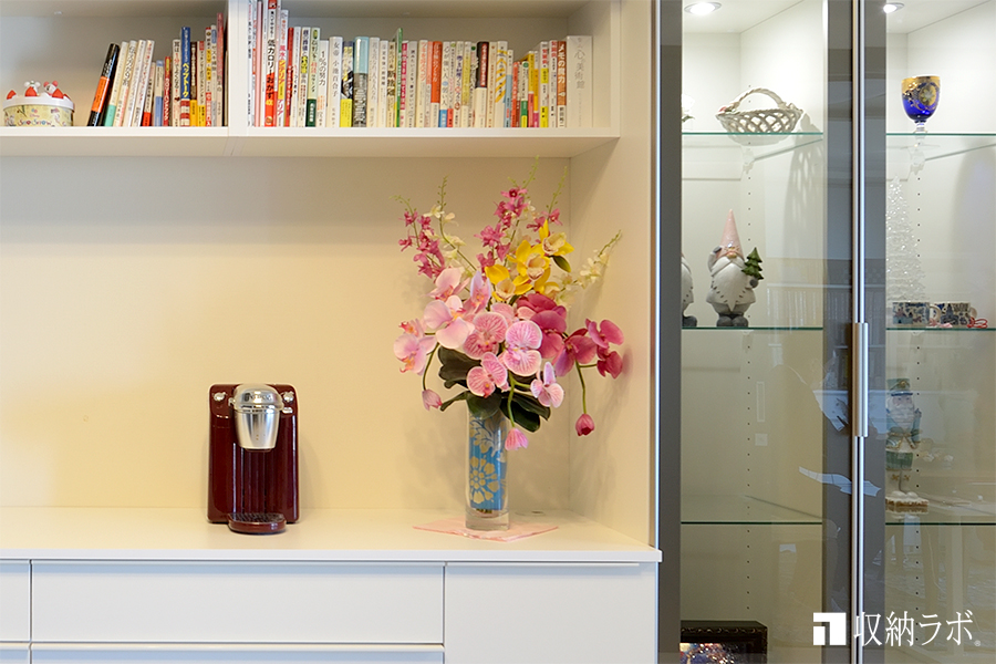 假屋崎省吾氏のお花は高さがあるのが特徴。お手持ちのお花と花瓶を採寸させていただき、飾り棚の左側にお花がピッタリ置けるスペースをつくりました。