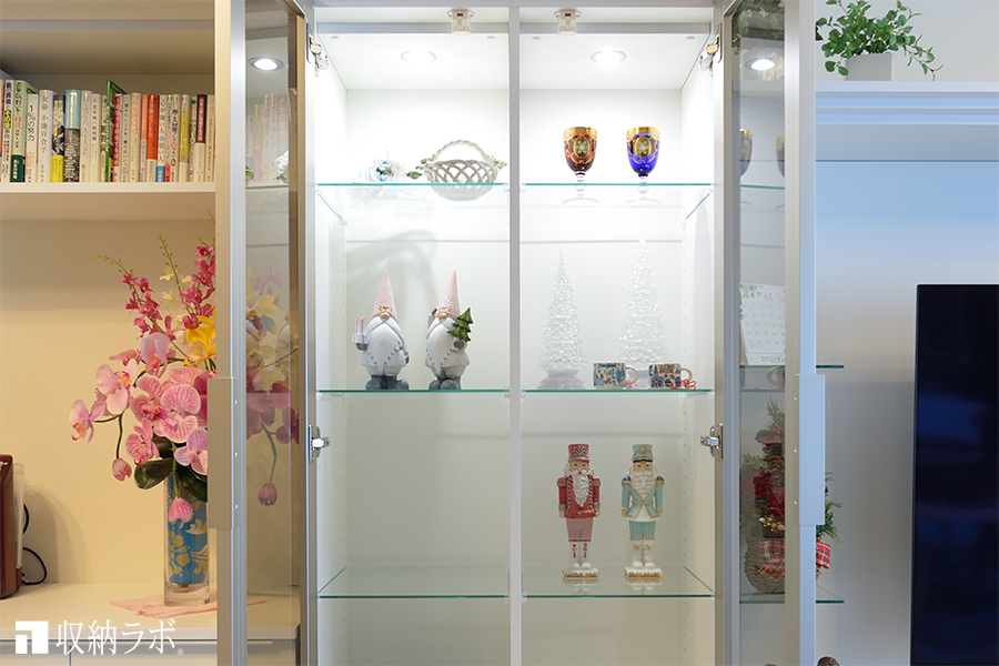 インテリア小物やオブジェをたくさんお持ちだったため、それぞれのサイズに合わせた高さのガラスの棚板を設置。飾り棚に組み込んだ照明をつけると、ディスプレイが一層引き立ちます。壁掛けテレビの両脇にも小さな棚板を設け、思い出の写真やお花などを飾っていただいています。