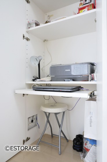 掃除機や書類を始めとした収納としての利用も見られますが、注目して頂きたいのは左下のパソコンデスクです。