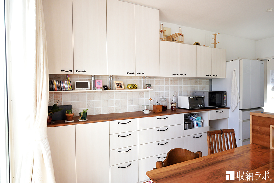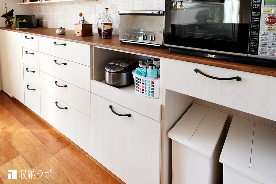 キッチンのサイズにぴったりで、デットスペースもできない。持っている調理家電やゴミ箱のサイズ、食器の量に合わせて、オーダーメイドで自由に設計してもらえるなら、決して高い買い物ではないと感じたといいます。