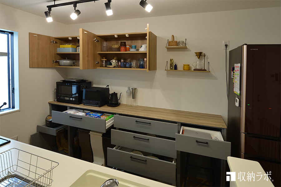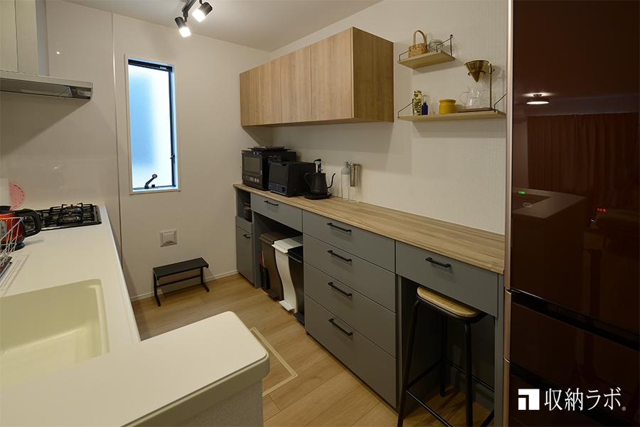 今回の場合、キッチンの壁面全体を壁面収納にすることもできましたが、圧迫感が出てしまうだけでなく、入れたいものに対して収納スペースが多すぎました。