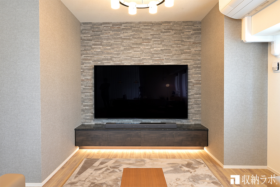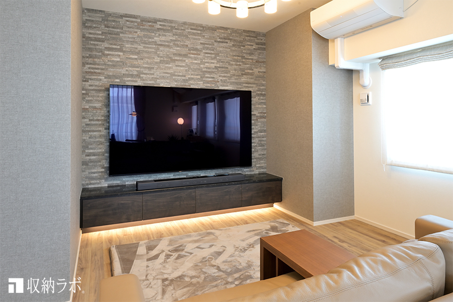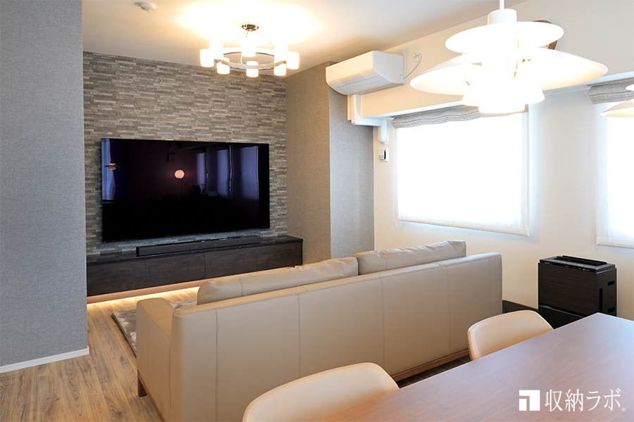 83インチの大型テレビを購入しようと考えておられたため、収納スペースはローボードのみで必要最低限に抑えています。そのため、大きな壁掛けテレビを設置しても圧迫感がありません。