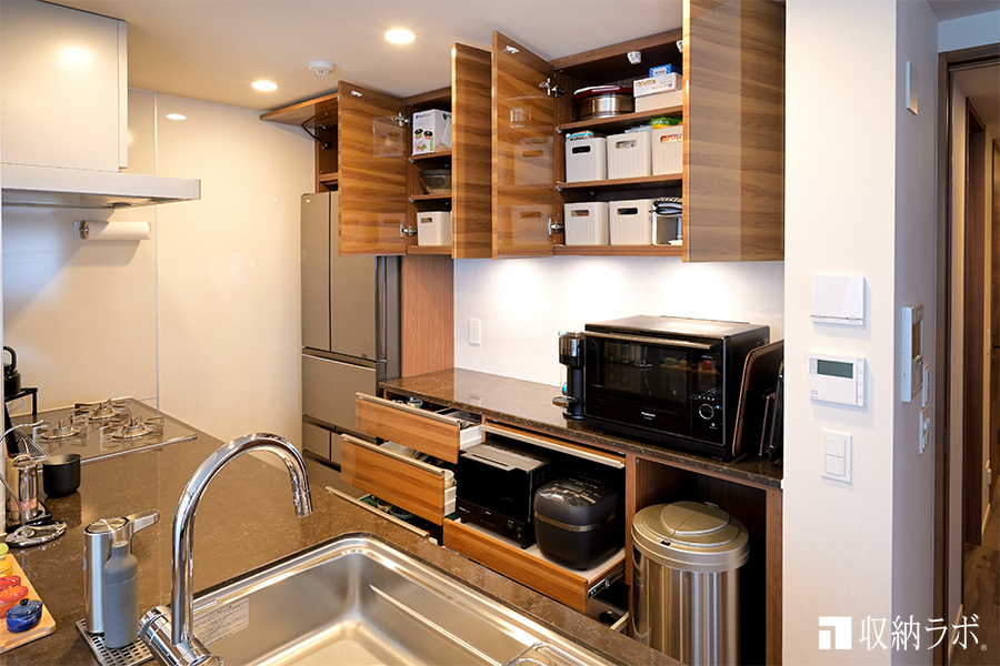 キッチン家電を収納する扉は、スライド式で上開きの収納扉を採用。スライド棚なので家電を引き出して使えます。