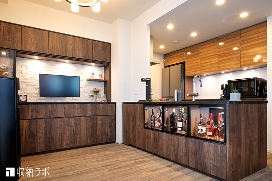 左側には、最短の動線を意識してグラス類を収納。飲みたいときにいつでもお酒が飲めるバーのようなスペースが完成しました。