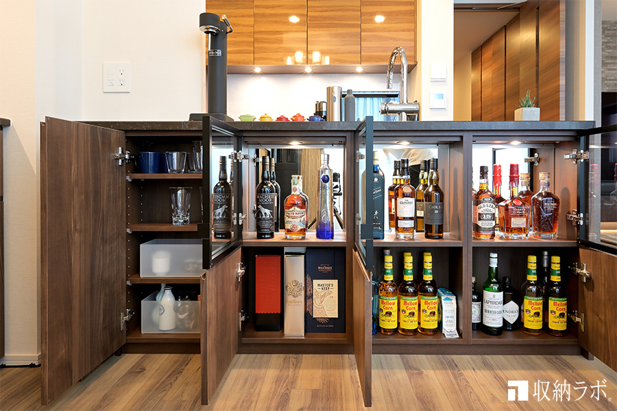 下段は、普段飲むお酒のストックを収納しています。扉で隠れるので中身は見えません。