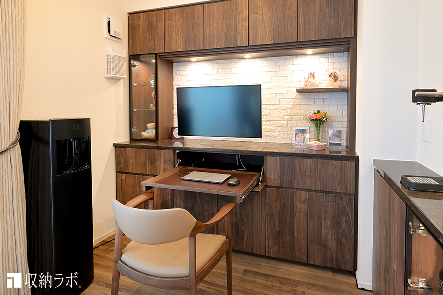 スライド棚にキーボードを置き、壁掛けのモニターを設置して、仕事がしやすい空間を実現。