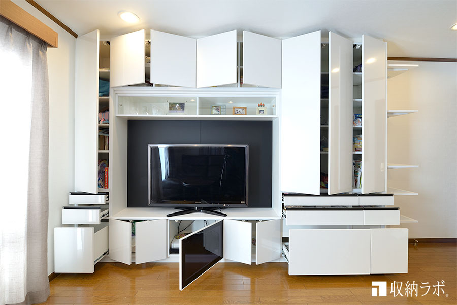 お客様の暮らしの変化を想定して、いつまでも快適にお使いいただける収納を実現した、リビングの壁面収納の事例でした。