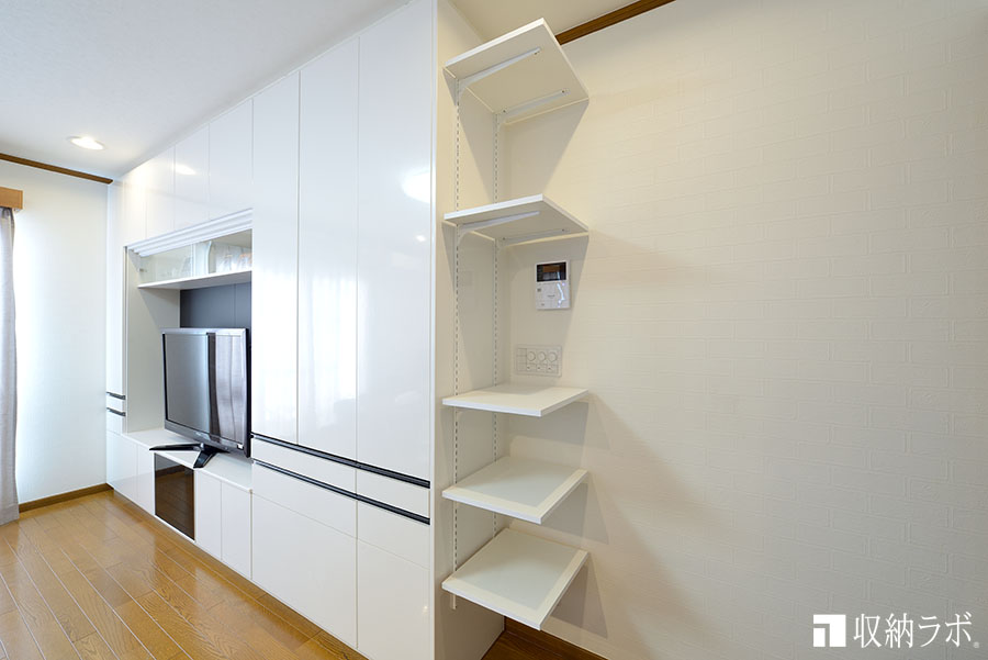 リビングの壁面収納を設置後に、壁面収納の横に多目的に使用できる可動式のオープン棚を増設しました。