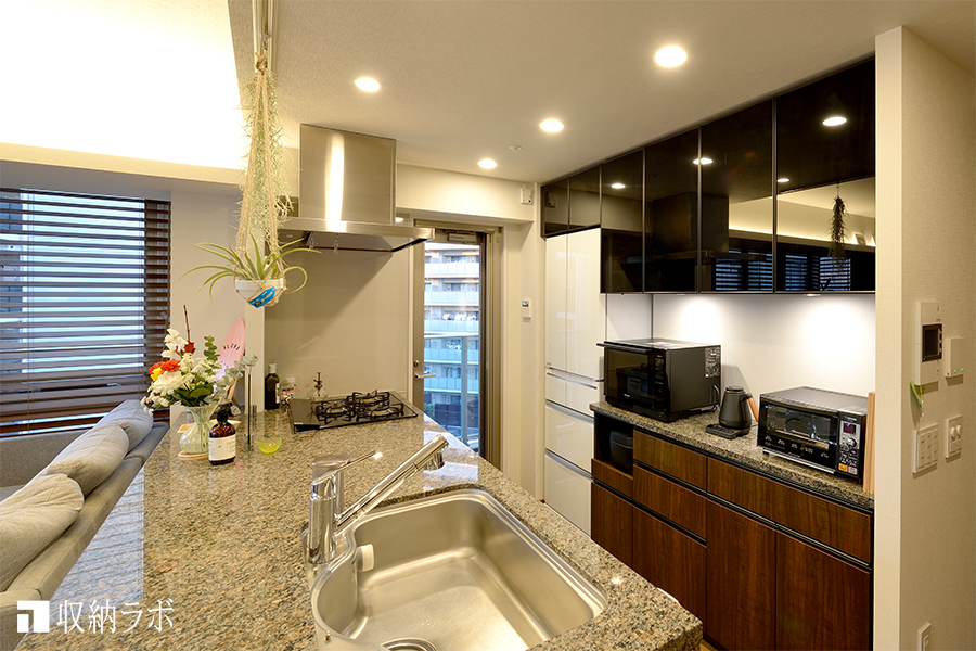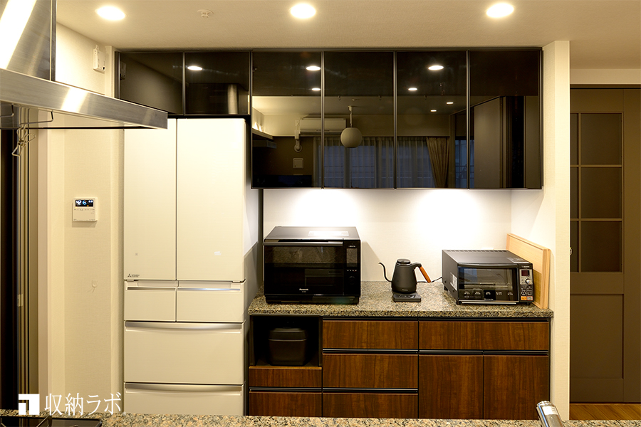 スタイリッシュなキッチンをイメージして、カップボードの吊り戸棚には、黒いガラス扉を採用しました。透明や半透明のガラスは、中身が見えてしまうので、どうしても生活感が出てしまいます。