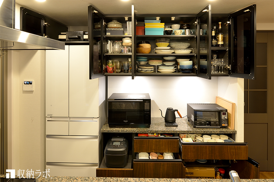 左側と中央の棚には、普段使いの食器や調理道具などを収納。食器に色や柄があっても、黒いガラス扉を閉めておけば、生活感を軽減できます。